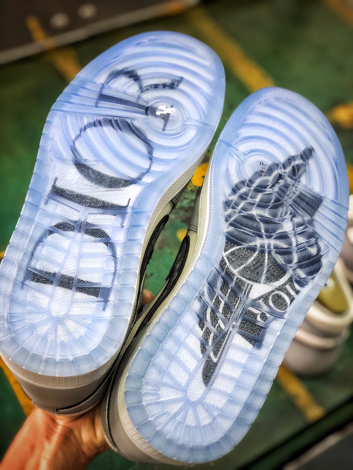 Полупрозрачная резиновая подошва под которой виднеются надписи «DIOR» и «AIR DIOR» c логотипом Jumpman Wings завершают дизайн этой коллаборации кроссовок.