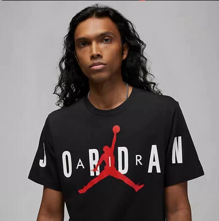Футболка украшена экстра-крупным принтом Jordan Air, который буквально «растягивается» по всей ширине изделия — от рукава до рукава, создавая динамичный и узнаваемый образ.